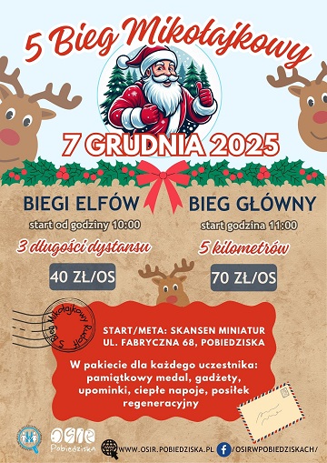 Zapraszamy do zapisów na 5 Bieg Mikołajkowy, który odbędzie się dnia 7 grudnia (niedziela) przy terenie Skansenu Miniatur (ul. Fabryczna 68) w Pobiedziskach.