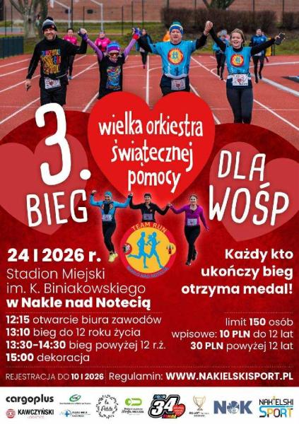 3 Bieg WOŚP odbędzie się w dniu 24 stycznia 2026 r. (sobota) na Stadionie Miejskim im. Klemensa Biniakowskiego przy ulicy Armii Krajowej 4 w Nakle nad Notecią.